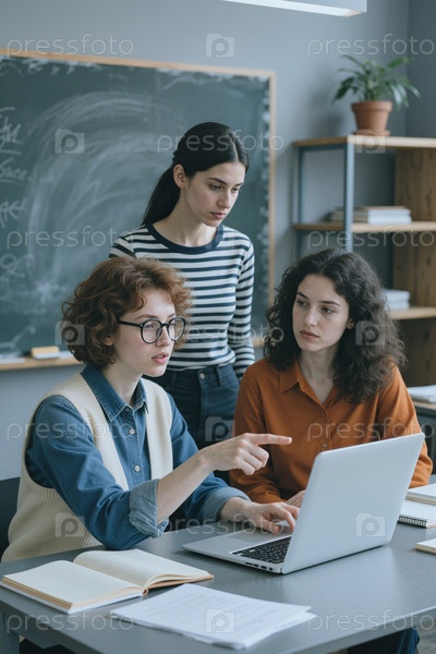 Молодые женщины, сотрудничающие в проекте с использованием ноутбука в классе