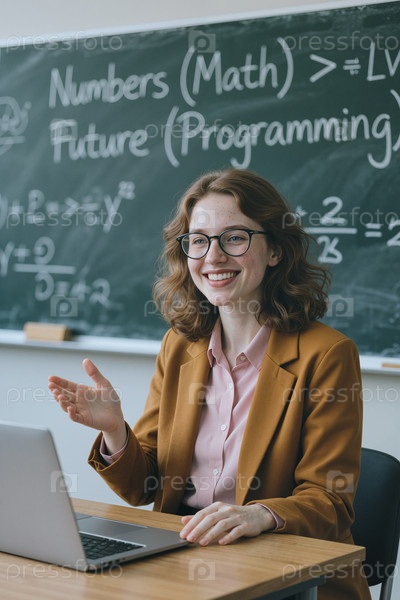 Портрет молодой женщины, преподающей математику с помощью ноутбука