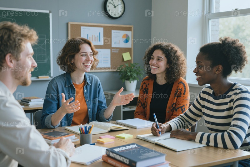Группа молодых мультиэтнических женщин и мужчин, сотрудничающих в классе