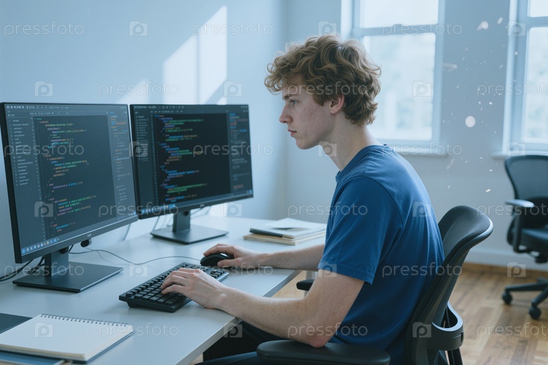 Молодой человек программирует программное обеспечение на двойных мониторах в современном офисе