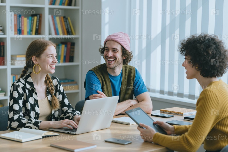 Мультиэтнические молодые люди сотрудничают и улыбаются во время офисной встречи