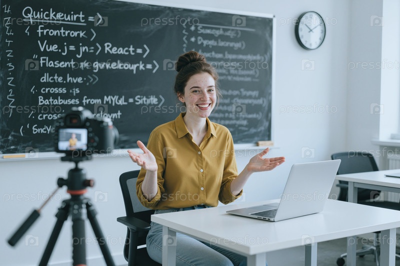 Портрет молодой женщины, преподающей онлайн-класс программирования