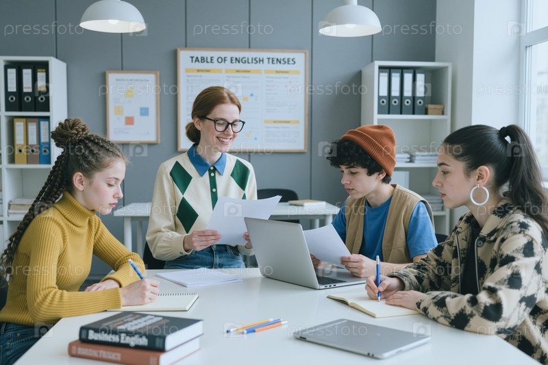 Женщина, обучающая разных подростков использованию ноутбука в классной обстановке