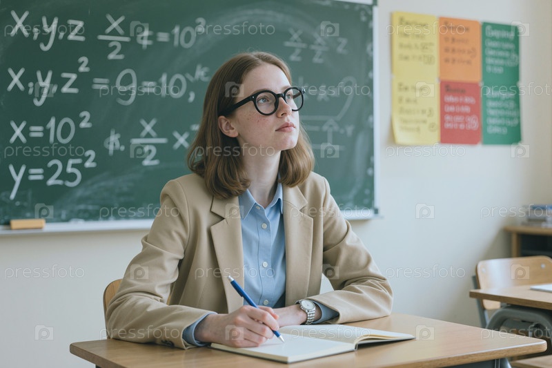 Молодая женщина сидит за рабочим столом и пишет в классной обстановке