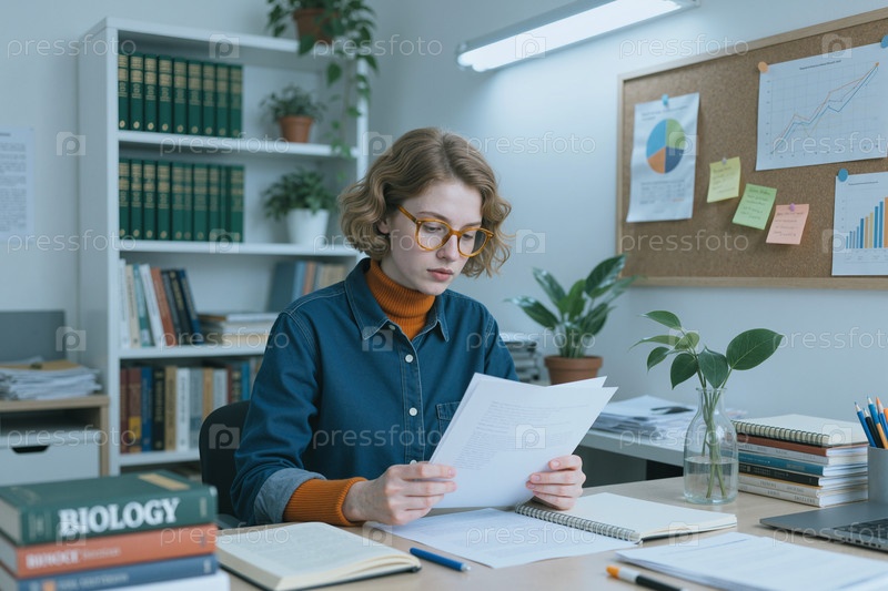 Молодая женщина анализирует документы, работая в современном офисе