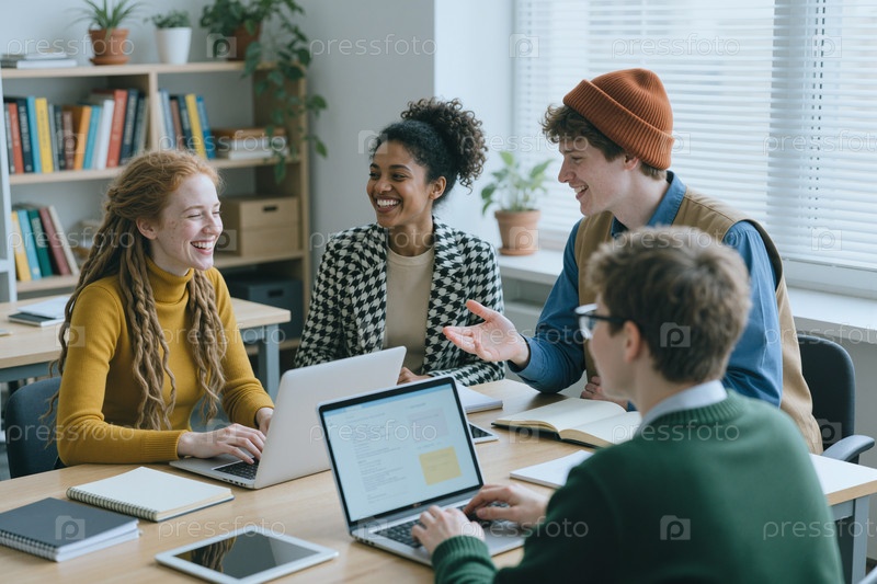 Различные молодые люди, сотрудничающие во время офисной встречи с ноутбуками
