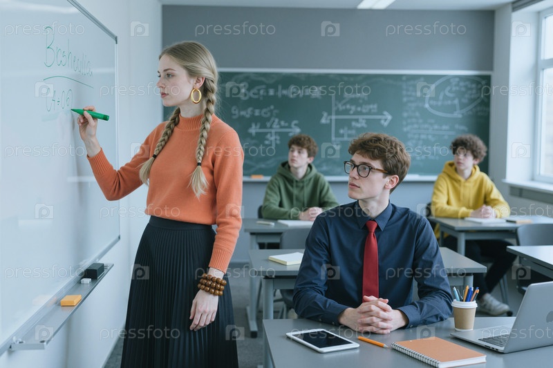 Молодая женщина преподает математику внимательным мальчикам-подросткам в классе
