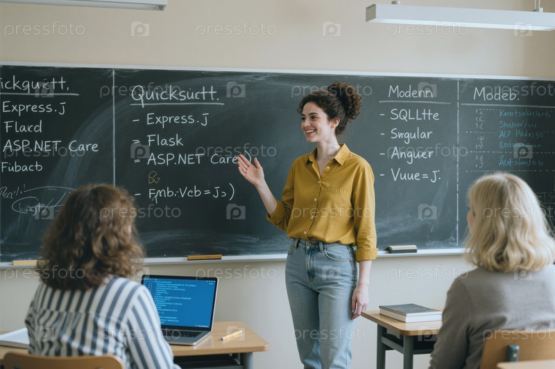 Молодая женщина преподает программирование различным группам студентов