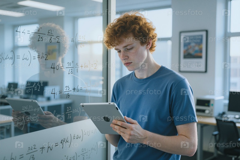 Молодой человек решает математические уравнения с помощью цифрового планшета