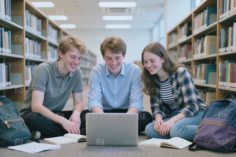 Мальчики и девочки-подростки сидят на полу, сотрудничают с помощью ноутбука