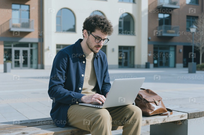 Взрослый мужчина, работающий на ноутбуке На улице в гибкой удаленной работе