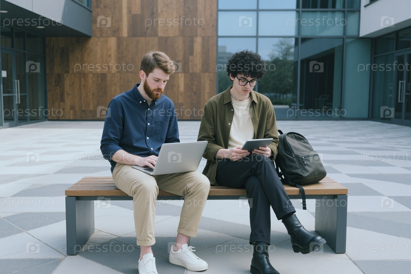 Взрослые мужчины работают на ноутбуке и планшете в современном дворе кампуса