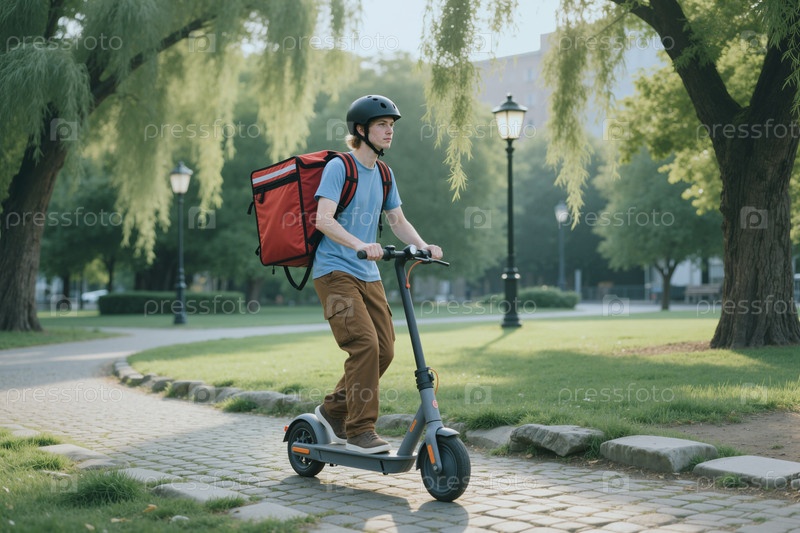 Взрослый человек доставляет еду на электрическом скутере для городской курьерской службы