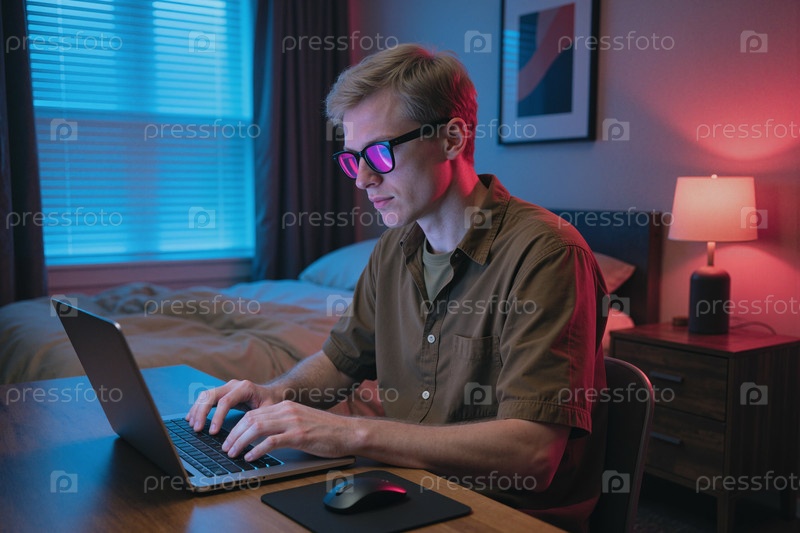 Взрослый мужчина, работающий на ноутбуке дома для кампании удаленной работы