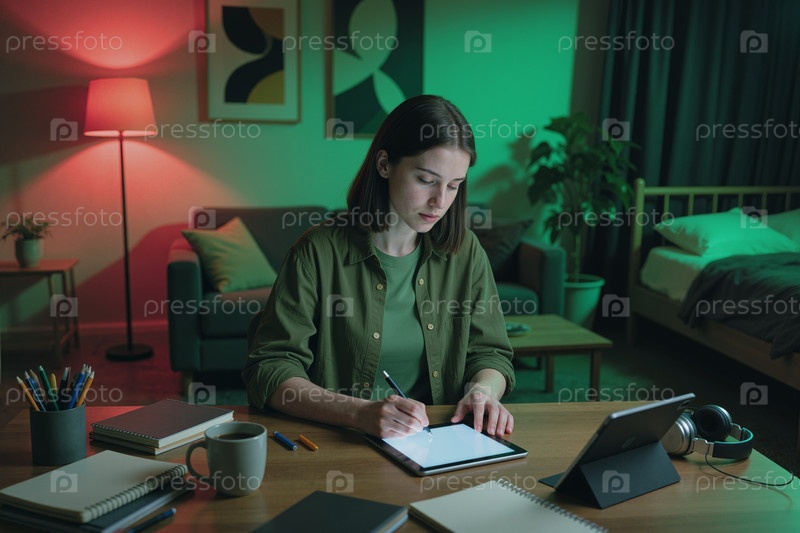 Взрослая женщина учится на планшете дома для онлайн-обучения