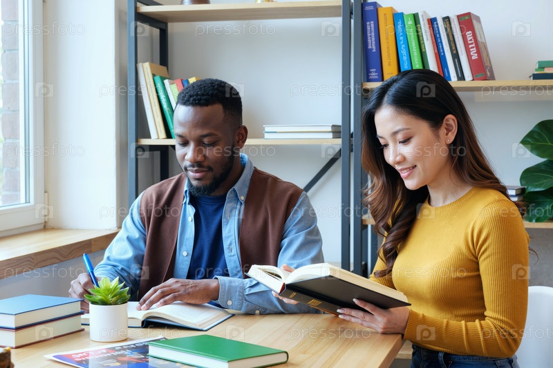 Молодой чернокожий мужчина и азиатская женщина учатся вместе за столом в помещении