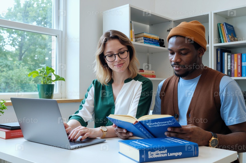 Молодая женщина и молодой чернокожий мужчина учатся вместе в библиотеке