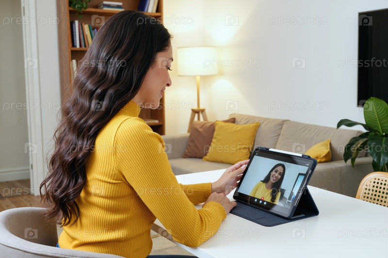 Молодая женщина проводит видеозвонку с подругой в помещении