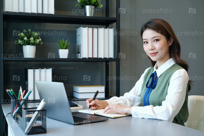 Портрет молодой азиатской женщины, работающей за столом и улыбающейся перед камерой
