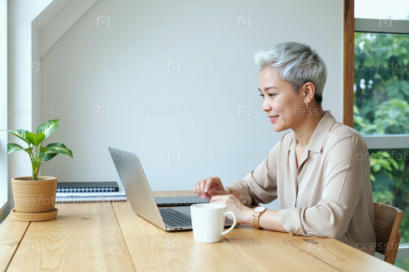 Взрослая женщина, работающая удаленно с помощью ноутбука в домашнем офисе