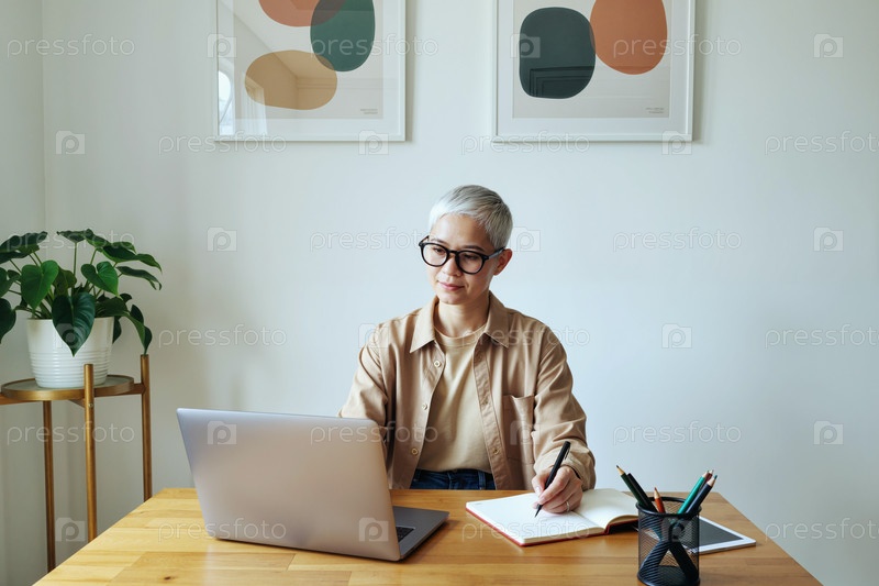 Старшая женщина, работающая удаленно с помощью ноутбука и записей
