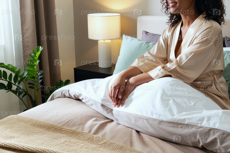 Молодая чернокожая женщина сидит на кровати, расслабляясь в уютной современной спальне