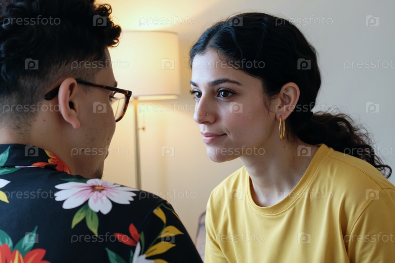 Молодая женщина улыбается, глядя на молодого человека в помещении