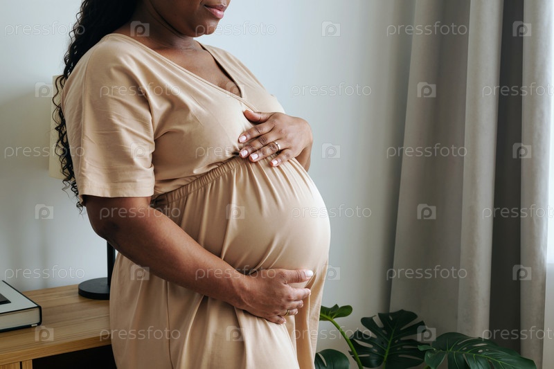 Беременная молодая чернокожая женщина держит брюхо, стоя в помещении
