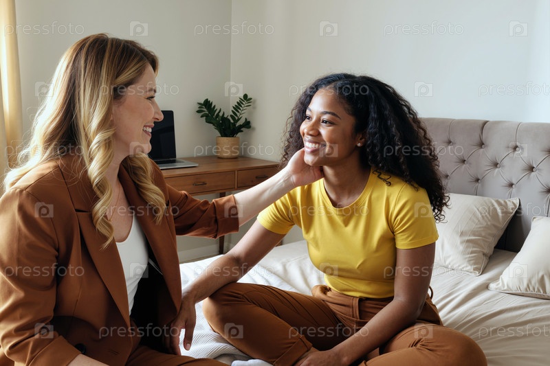 Молодая женщина утешает улыбающейся молодой чернокожей женщиной, сидящей в помещении