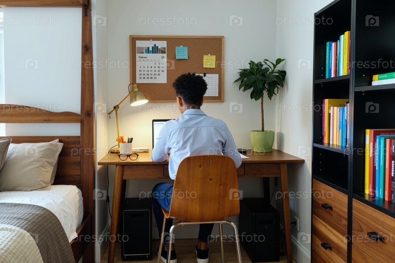 Молодой чернокожий мужчина работает на ноутбуке за столом в современном домашнем офисе