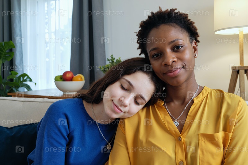 Портрет молодой женщины, отдыхающей головой на юной чернокожей женщине с улыбкой