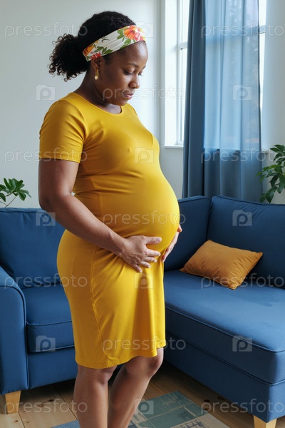 Беременная молодая чернокожая женщина, стоящая в помещении и касающаяся живота