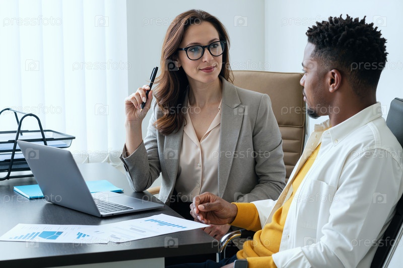 Взрослая женщина обсуждает бизнес-стратегию с молодым чернокожим мужчиной