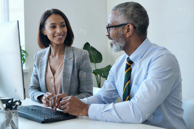 Старший мужчина и молодая чернокожая женщина сотрудничают в офисе