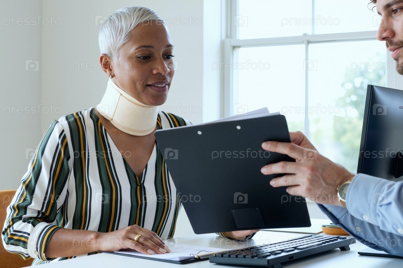 Чёрная женщина, носящая шейную скобку Консультационный мужчина Профессиональный взрослый в помещении