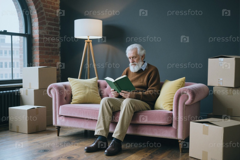 Старший мужчина сидит на диване, читает книгу среди перемещающихся ящиков