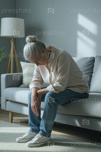 Пожилая женщина сидит на диване, выглядя грустной и созерцающей
