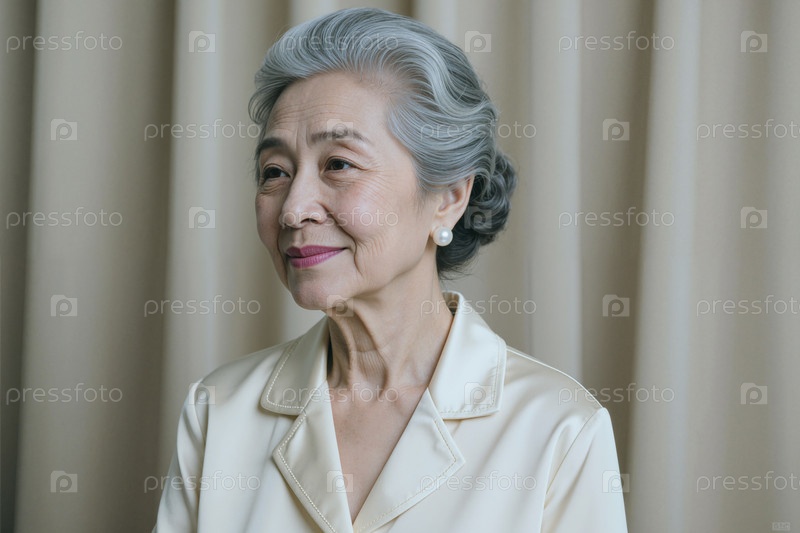 Старшая азиатская женщина улыбается, стоя в помещении на нейтральном фоне