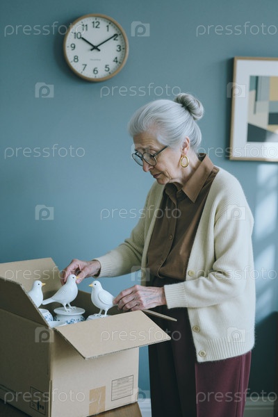 Старшая женщина распаковывает керамические птицы из картонной коробки в помещении