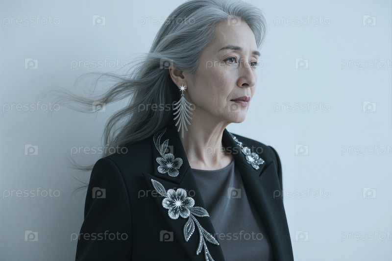 Старшая азиатская женщина позирует в студии, надевая элегантные украшения и блейзер