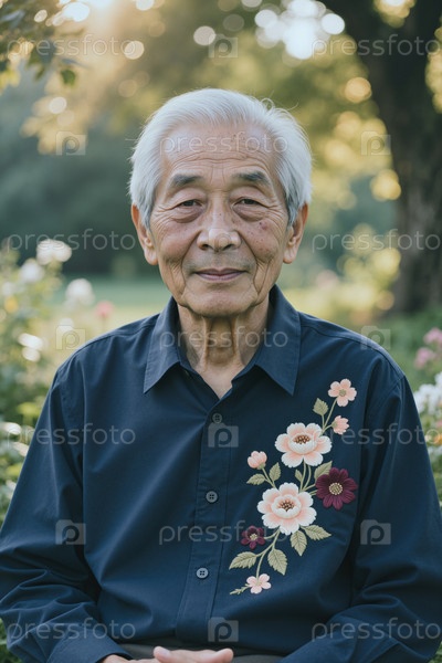 Портрет старшего азиатского мужчины, сидящего на улице и улыбающегося камере в саду