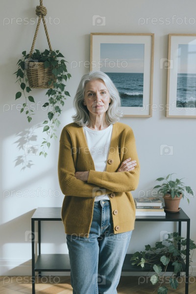 Портрет пожилой женщины, стоящей в помещении со скрещенными руками