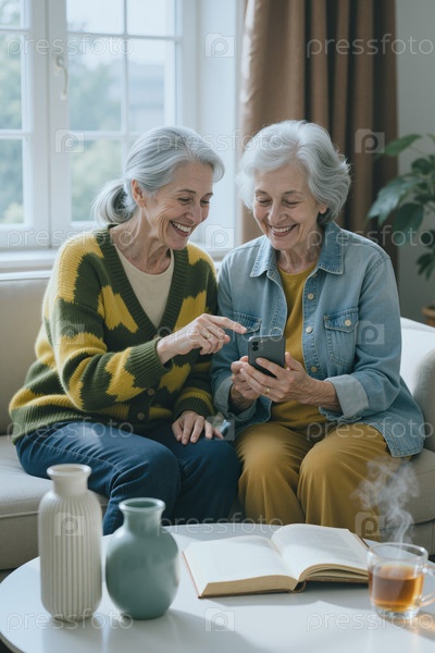 Пожилые женщины сидят вместе, используя смартфоны и улыбаются в помещении