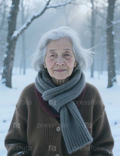 Портрет старшей азиатской женщины, улыбающейся на улице зимой в снежном лесу