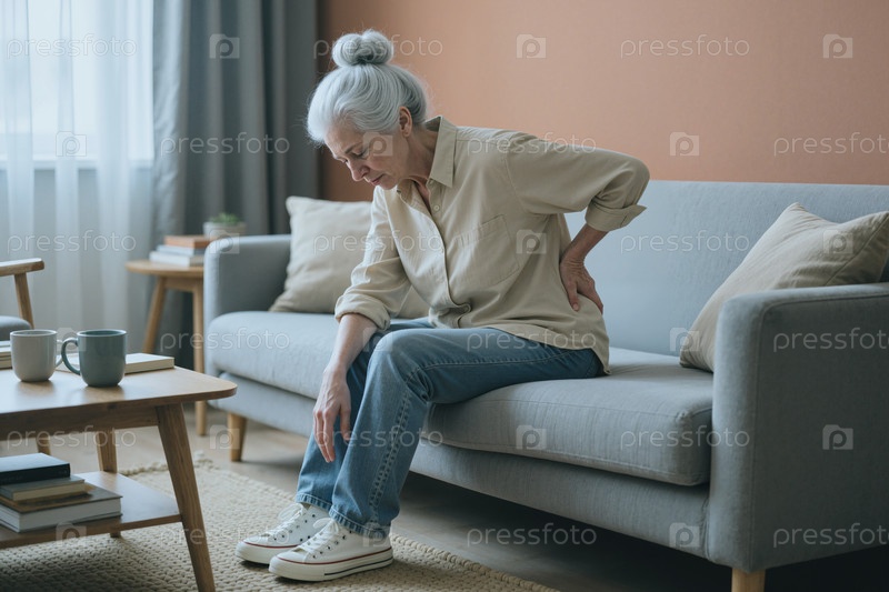Пожилая женщина сидит на диване, прикасаясь к боли в спине и ноге