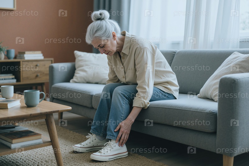 Пожилая женщина сидит на диване, прикасается к лодыжке и испытывает боль