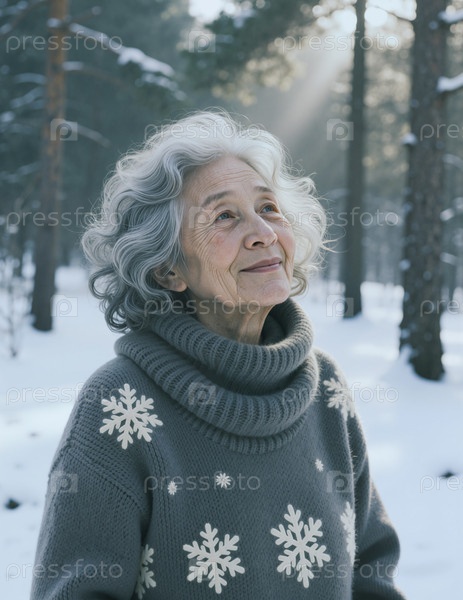Портрет пожилой женщины, улыбающейся, стоящей в снежном лесу