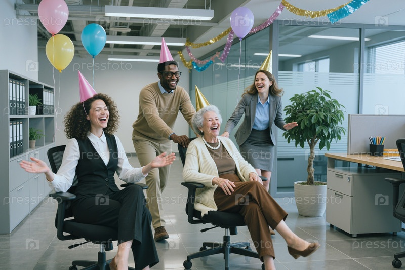 Разнообразные молодые люди и пожилая женщина празднуют день рождения в офисе