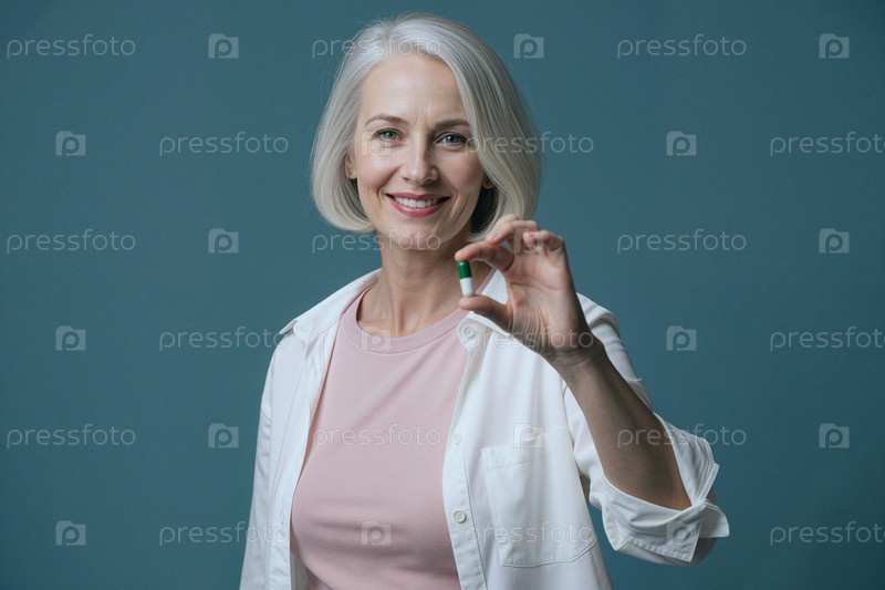 Старшая женщина улыбается, держа капсулу на синем фоне