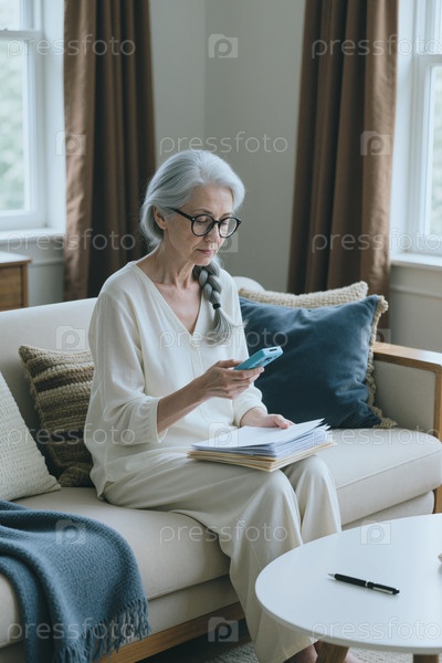 Пожилая женщина сидит на диване, используя смартфон и читает документы